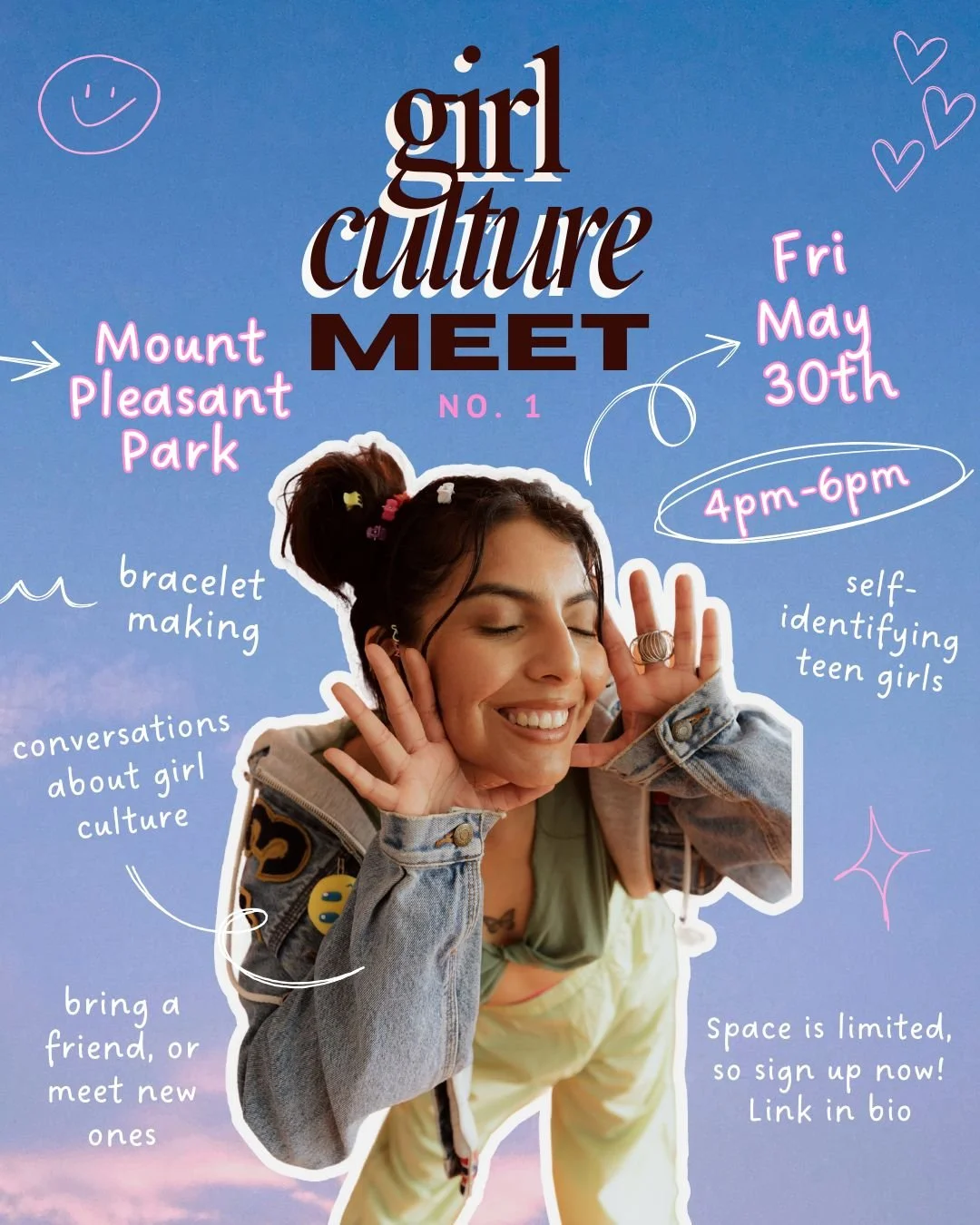 Welcome to Girl Culture Meet No.1! Join us for our first in-person meetup to connect with Ali and Fiona and other self-identifying teen girls; create together and start redefining our girl culture. First of three meets this summer with surprises, snacks and swag.
